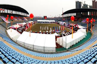 體育賽事篷房的魅力并不全在于外觀,更在于便捷性。對于不同場地的大小,可以自由組合篷房的間數和不同賽事的需求。對于場地的地面無論是沙地,草地,水泥地還是如大理石那樣不可破壞的地面,體育賽事篷房可以用膨脹螺絲、鋼釬以及承重盤,使篷房能夠安全穩固的進行搭建和使用,保證體育賽事的順利進行。